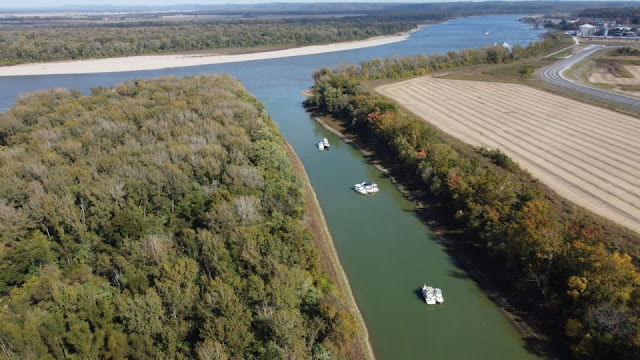 Just before mile marker 194 we headed to port at the Chain of Rocks Canal. Missing this turn would prove to be a serious error as not making the turn would have placed us into, well...a chain of rocks and a dam. A 44' sailing vessel did just that in October of 2021. The crew was rescued but the boat was destroyed. There is a large blue arrow that says "LOCK" and points to the left, they missed it anyway.